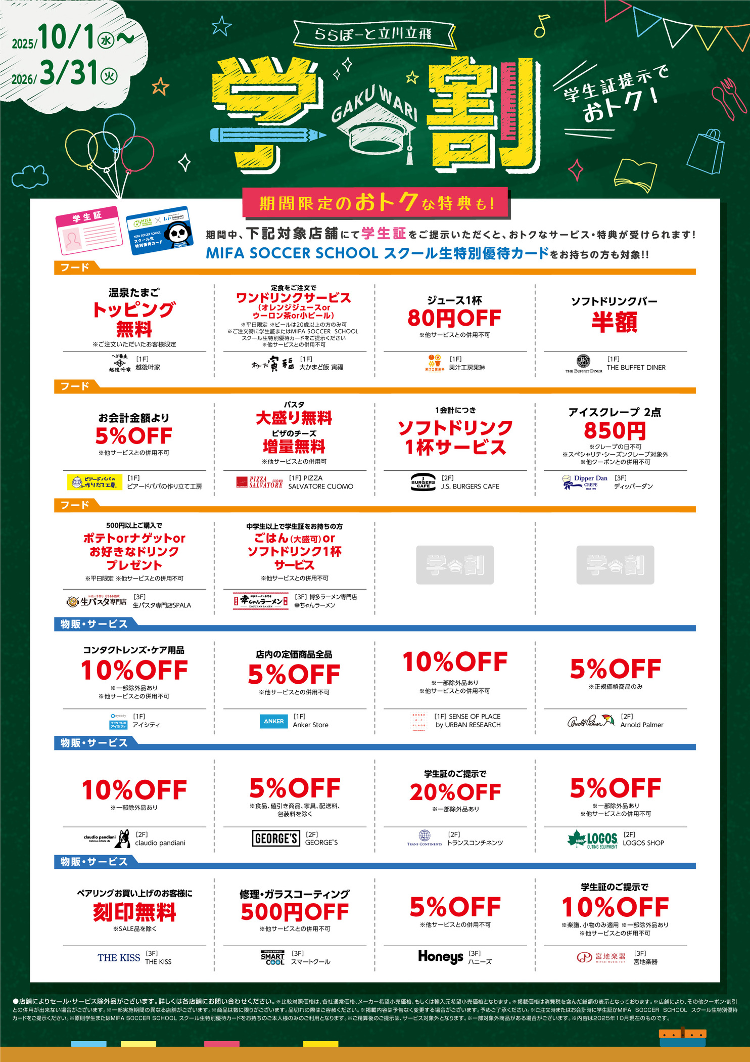 - 学生証提示でおトク!学割特典! MIFA SOCCER SCHOOL スクール生も対象!