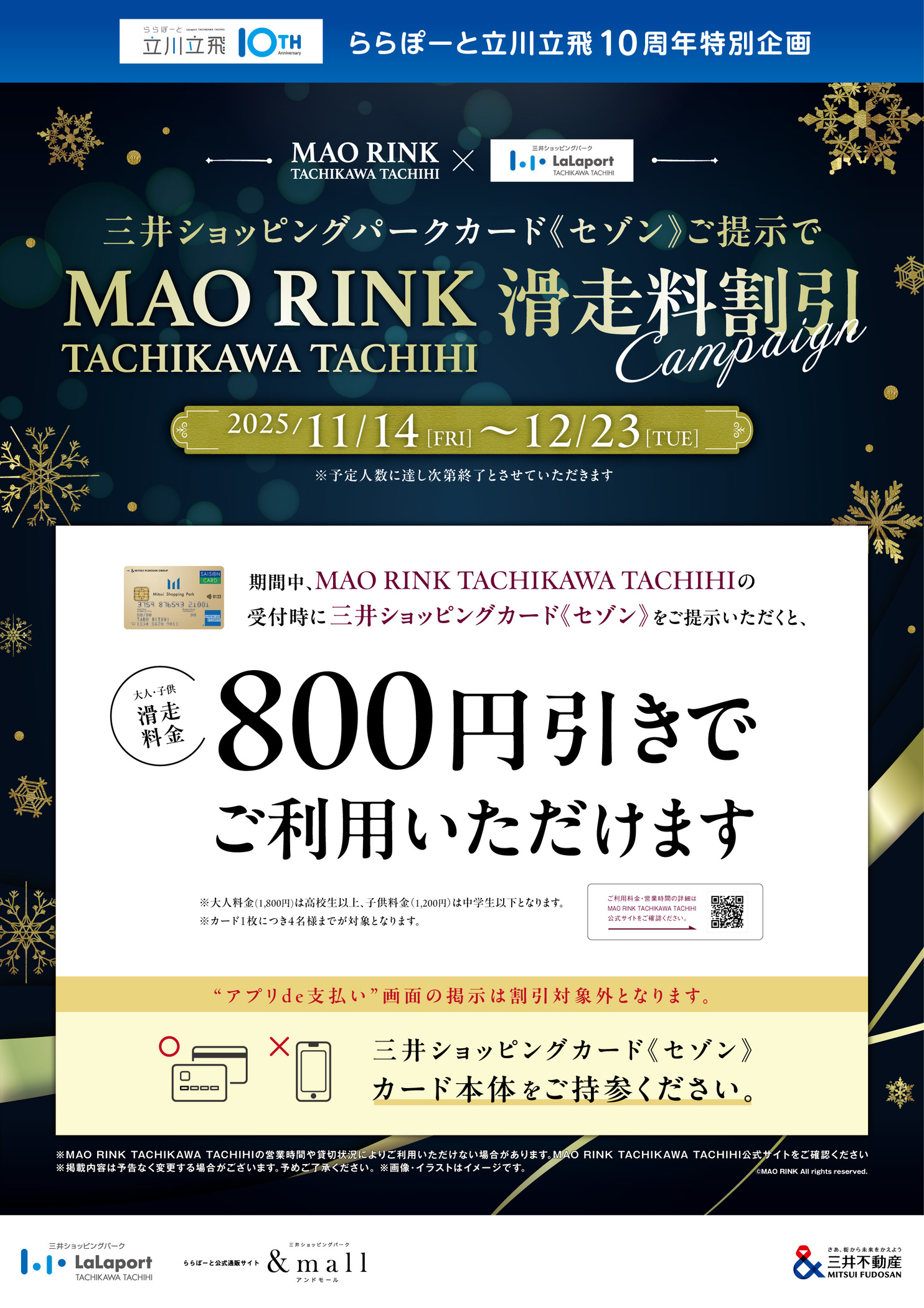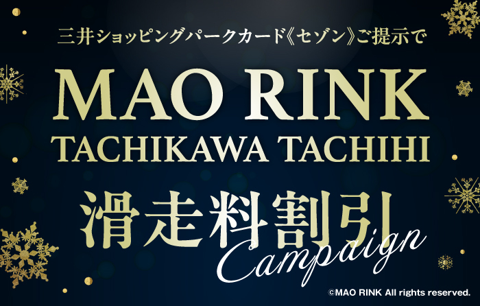 期間中、MAO RINK TACHIKAWA TACHIHI の受付時に 三井ショッピングカード《セゾン》をご提示いただくと、