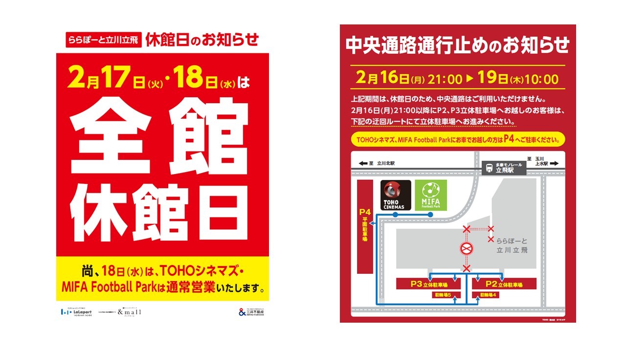ららぽーと立川立飛におきましては、以下の2日間を全館休館日とさせていただきます。