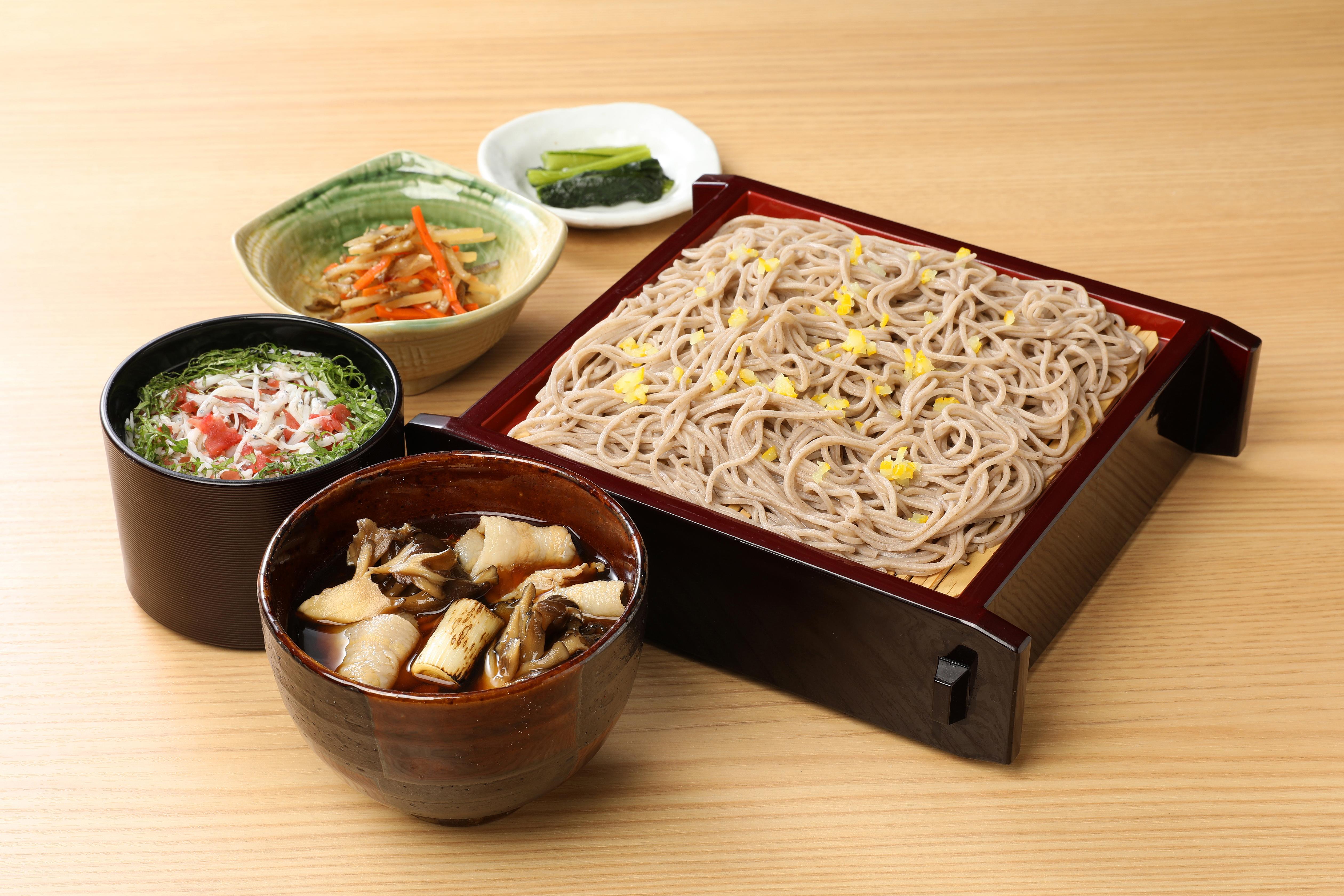 純穂豚の甘みのある脂と濃厚な味わいの黒舞茸のつけ汁蕎麦です。爽やかな香りの柚子皮で蕎麦を召し上がりください。