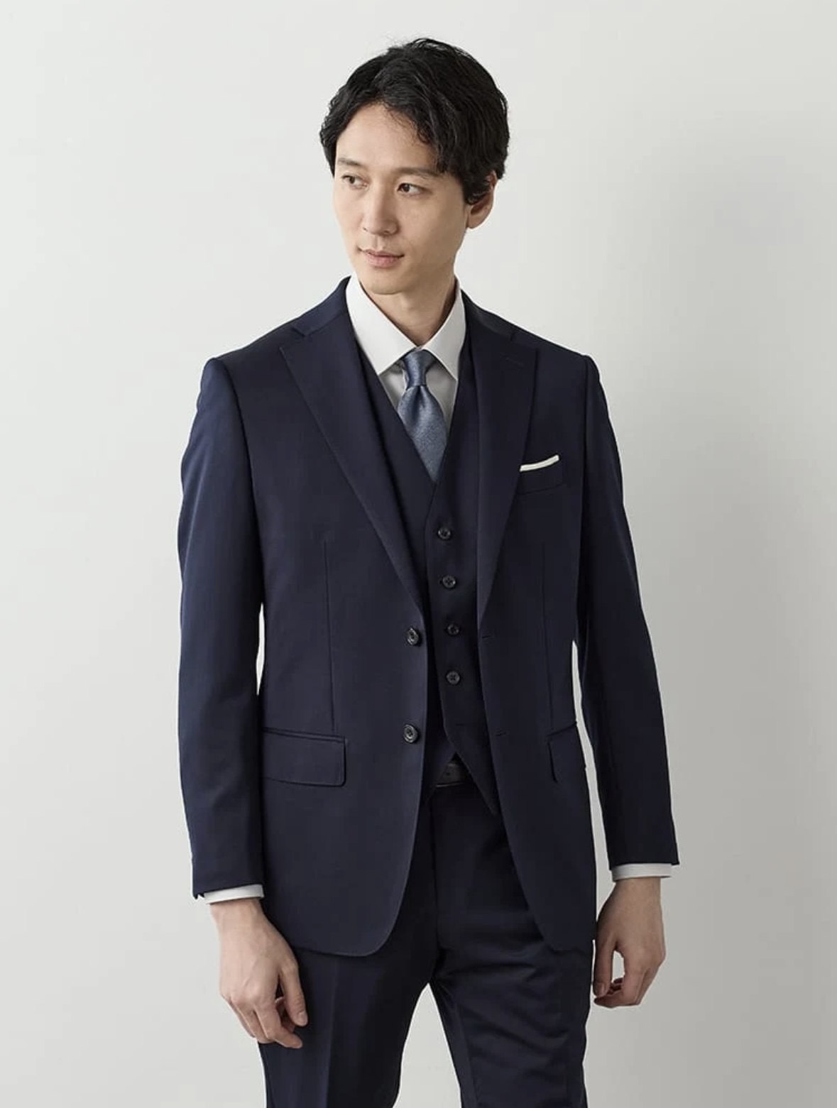 3シーズン、様々なシーンで着用可能な無地の3ピーススーツ。