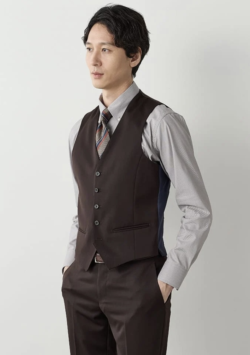 端正な2ボタンジャケット、ノータックスラックス、ベストをセットにしています。