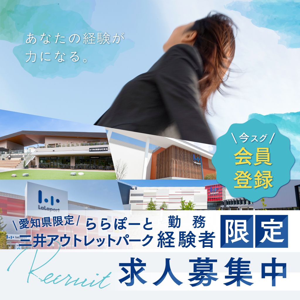 ・ららぽーと(名古屋みなとアクルス・愛知東郷・安城)および三井アウトレットパーク岡崎での勤務経験がある方(デジタル従業員証はたLcukの登録のあった方)