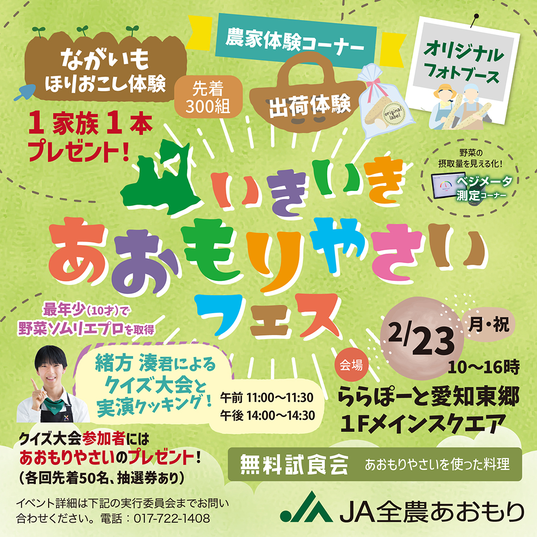 2/23(月・祝)10~16時ららぽーと愛知東郷1Fメインスクエアにていきいきあおもりやさいフェス開催。