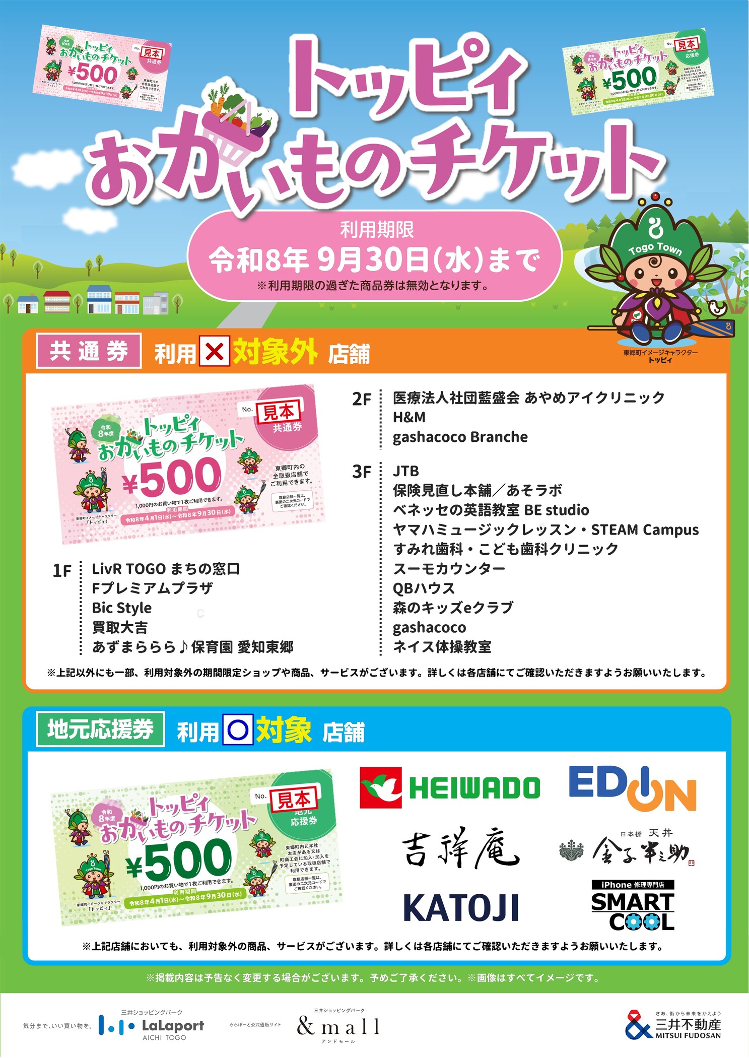 4月1日(水)~9月30日(水)までの期間、東郷町発行の『トッピィおかいものチケット』がららぽーと愛知東郷内の各店舗でご利用いただけます♪