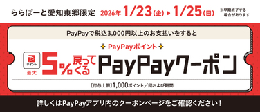 【ららぽーと愛知東郷限定】PayPayで税込3,000円以上のお支払いをするとPayPayポイント最大5%戻ってくるクーポン