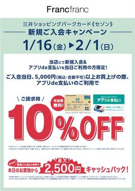 < Francfranc限定>三井ショッピングパークカード《セゾン》へご入会&アプリde支払いご利用でご請求時10%OFF!