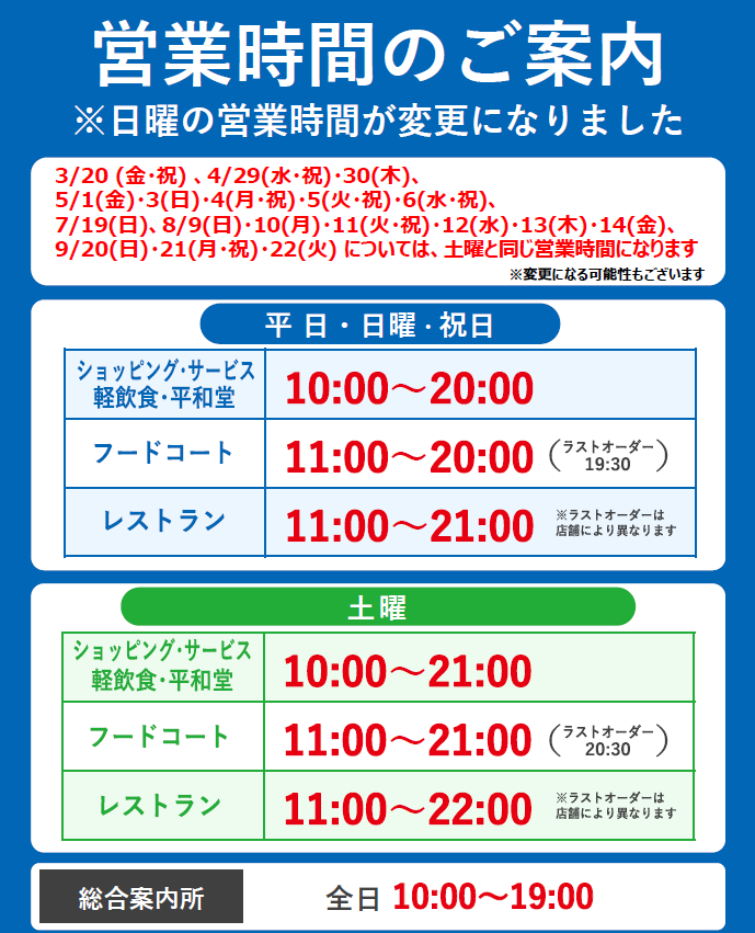 営業時間のご案内となります。日曜の営業時間が変更になりました。