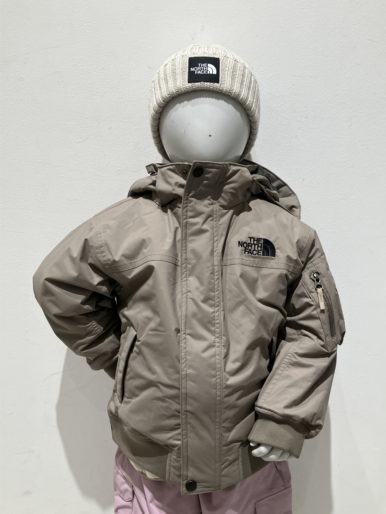 落ち着いたニュアンスカラーのボンバージャケットに、機能性に優れたピンクのスノーオーバーパンツを合わせました。