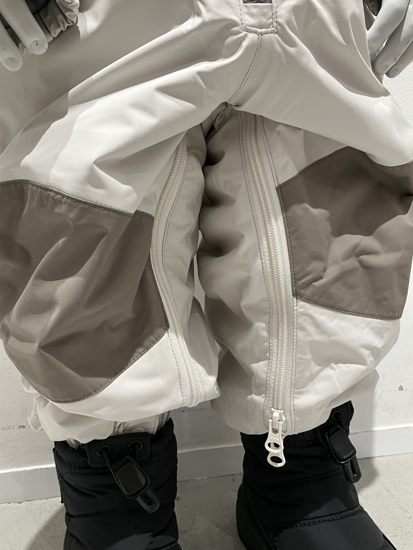 裾がずり上がりにくい設計で、抱っこ時も安心です。股下はファスナーで全開でき、おむつ替えや着脱がスムーズなのも嬉しいポイント。