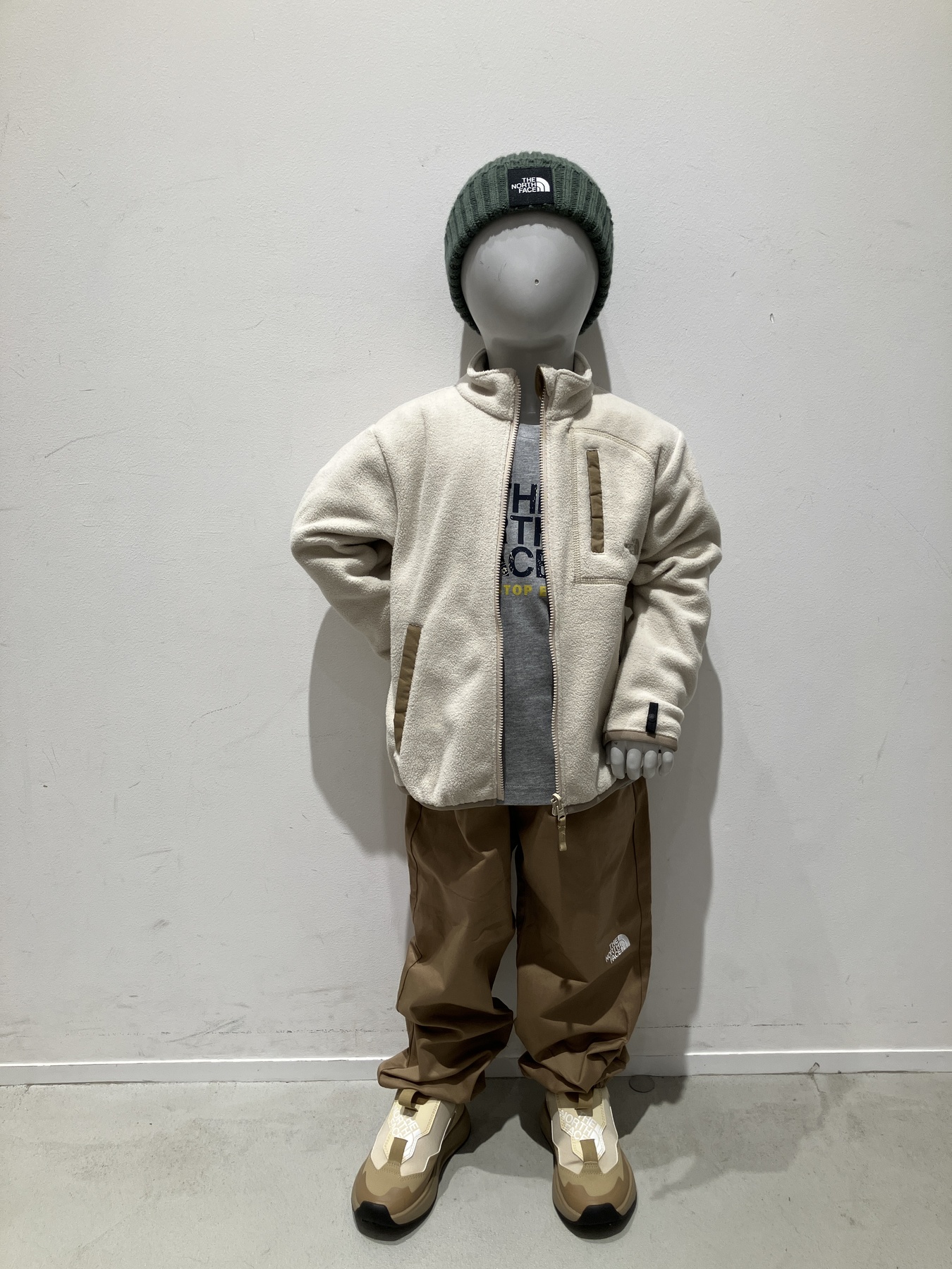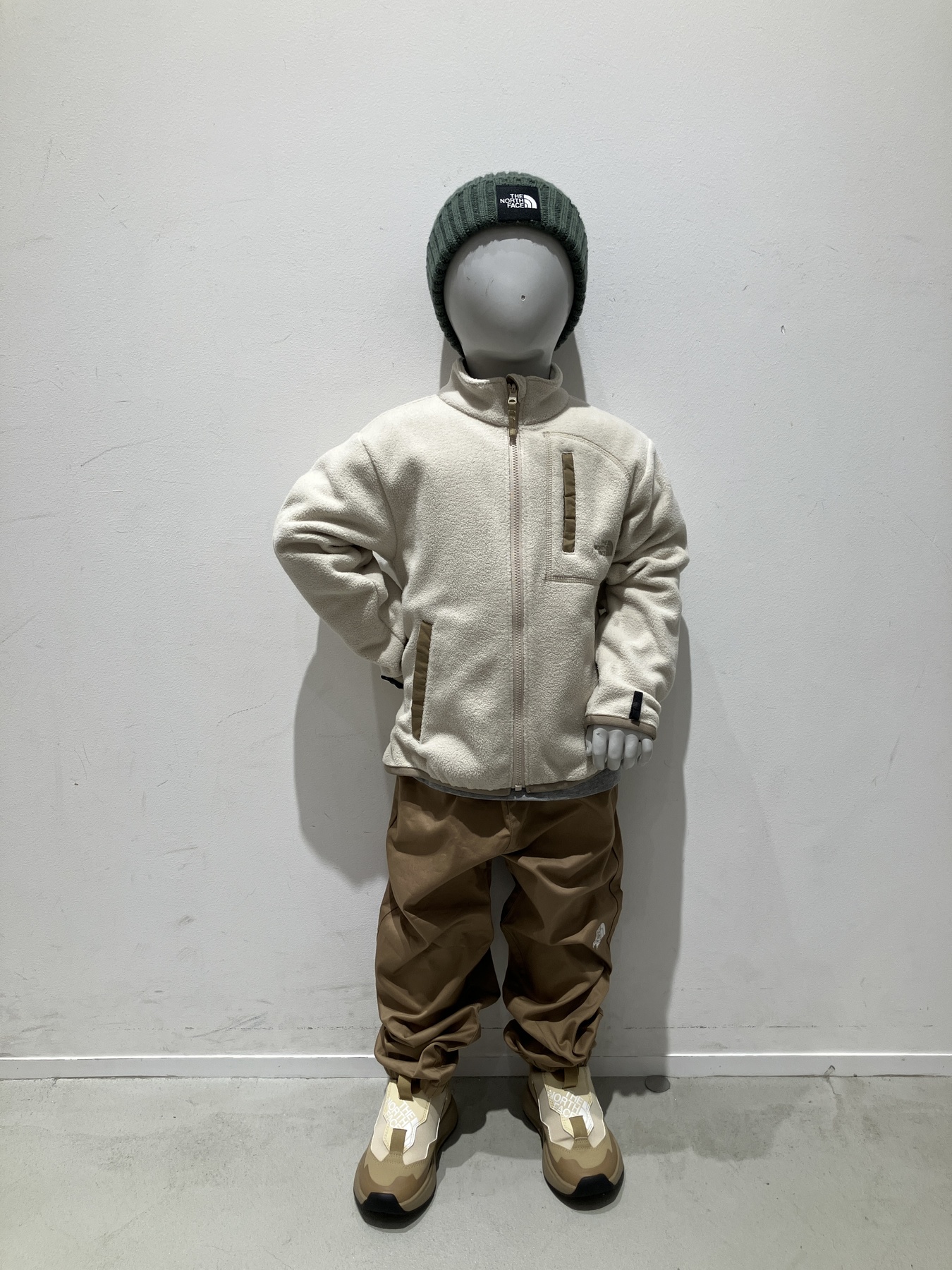 タウンユースで活躍する200マイクロフリースを採用したキッズジャケットに、ベージュパンツとオリーブのニット帽を合わせたナチュラルコーディネートを組みました。