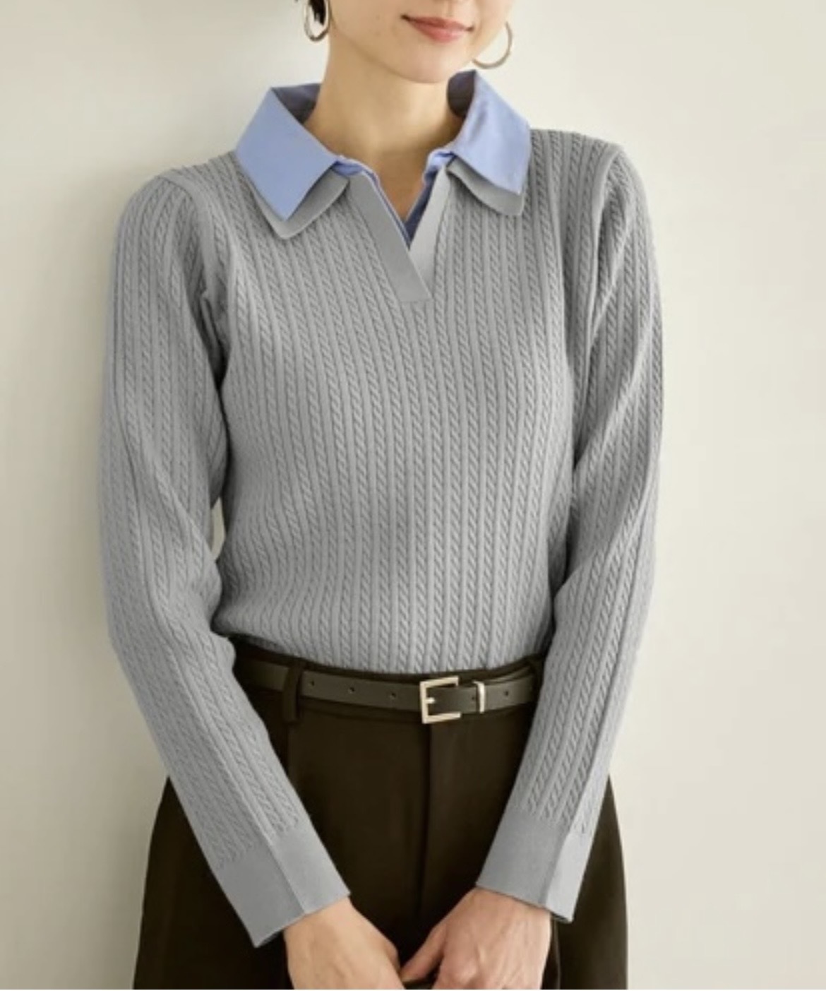 ・衿元には布帛シャツカラーをドッキングし、レイヤード風のディテールに。