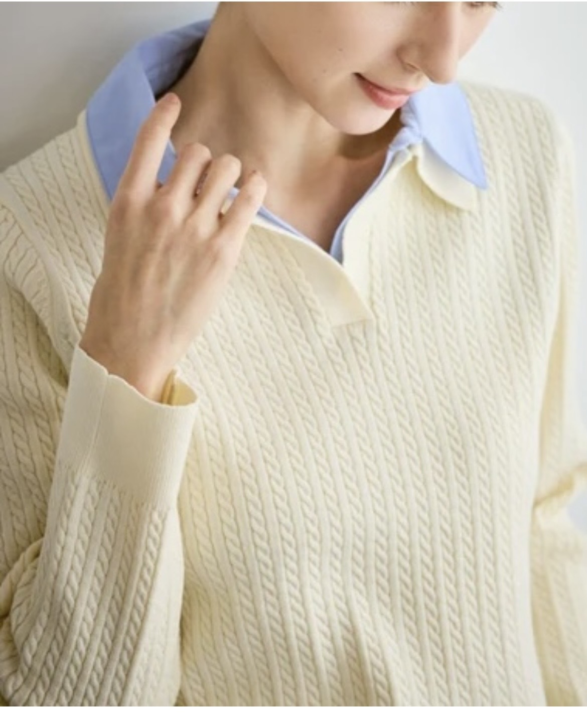 ・ハイゲージで上品に仕上げたミニケーブル編みがポイント。