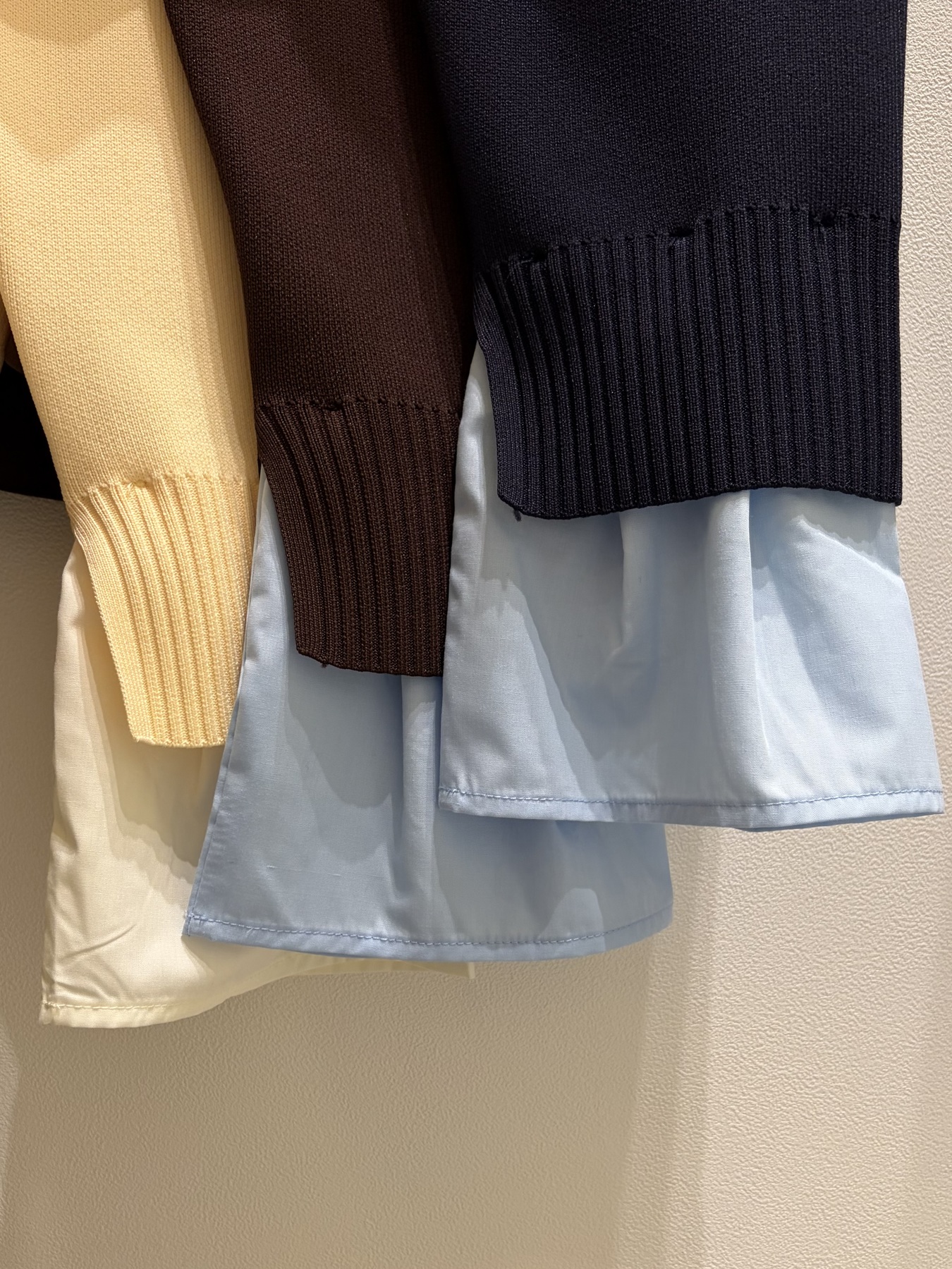 ・布帛パーツはさらりとした肌触りで、上品な印象を引き立てる異素材コンビ。