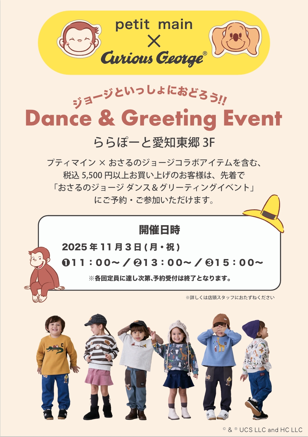プティマイン×おさるのジョージコラボアイテムを含む、税込み5,500円以上お買い上げのお客様は、先着で「おさるのジョージダンス&グリーティングイベント」にご予約・ご参加いただけます。
