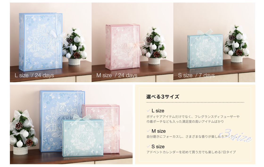 自分へのご褒美にはもちろん、大切な方へのギフトやアドベントカレンダー初心者の方でも楽しめる3サイズをラインアップしました。