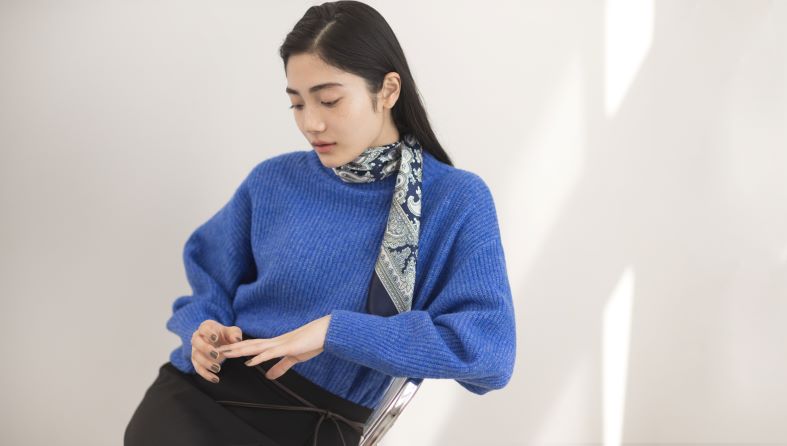 ウール混の素材を使用しており、滑らかな肌触りともっちりとした風合いが特徴。