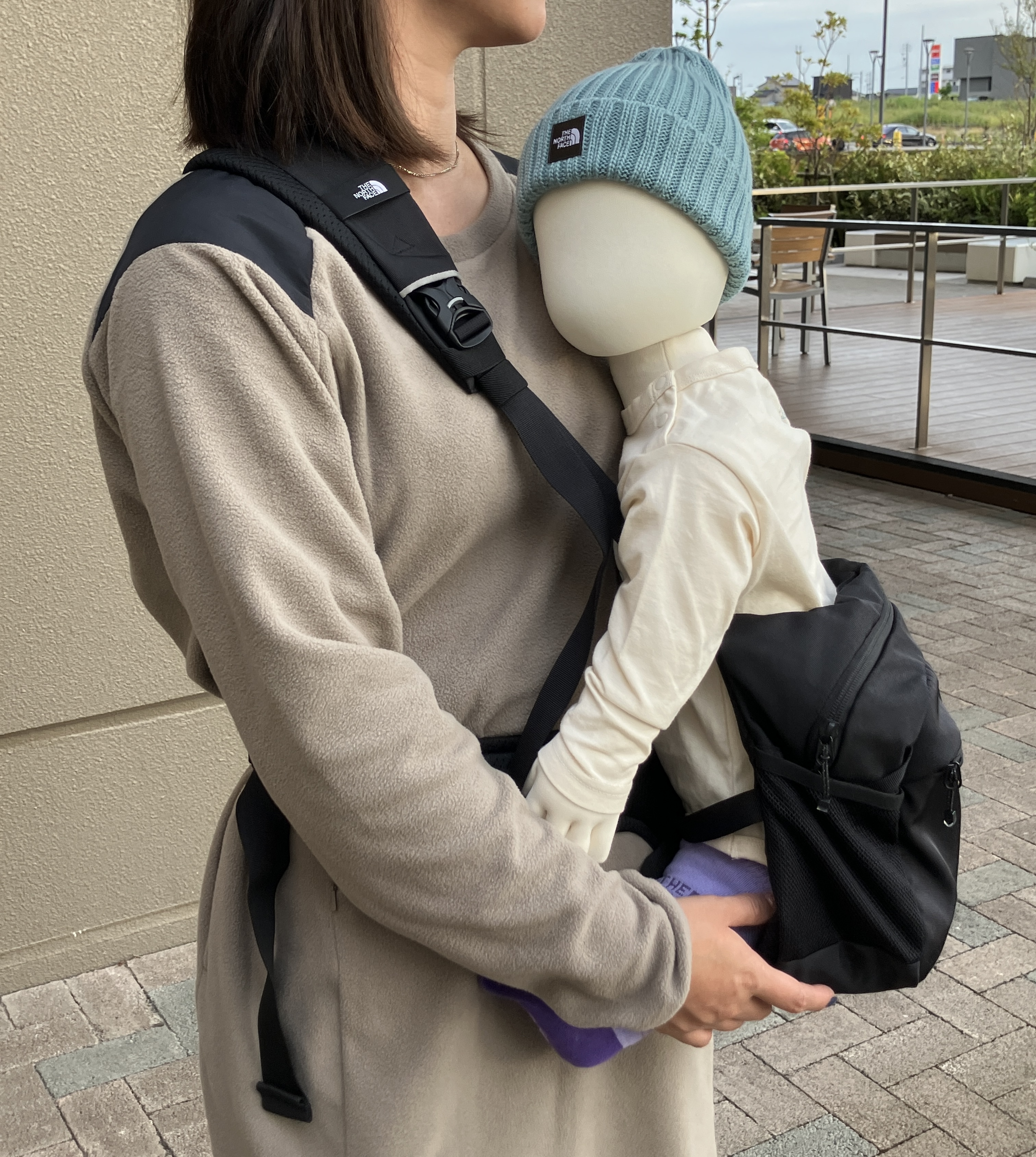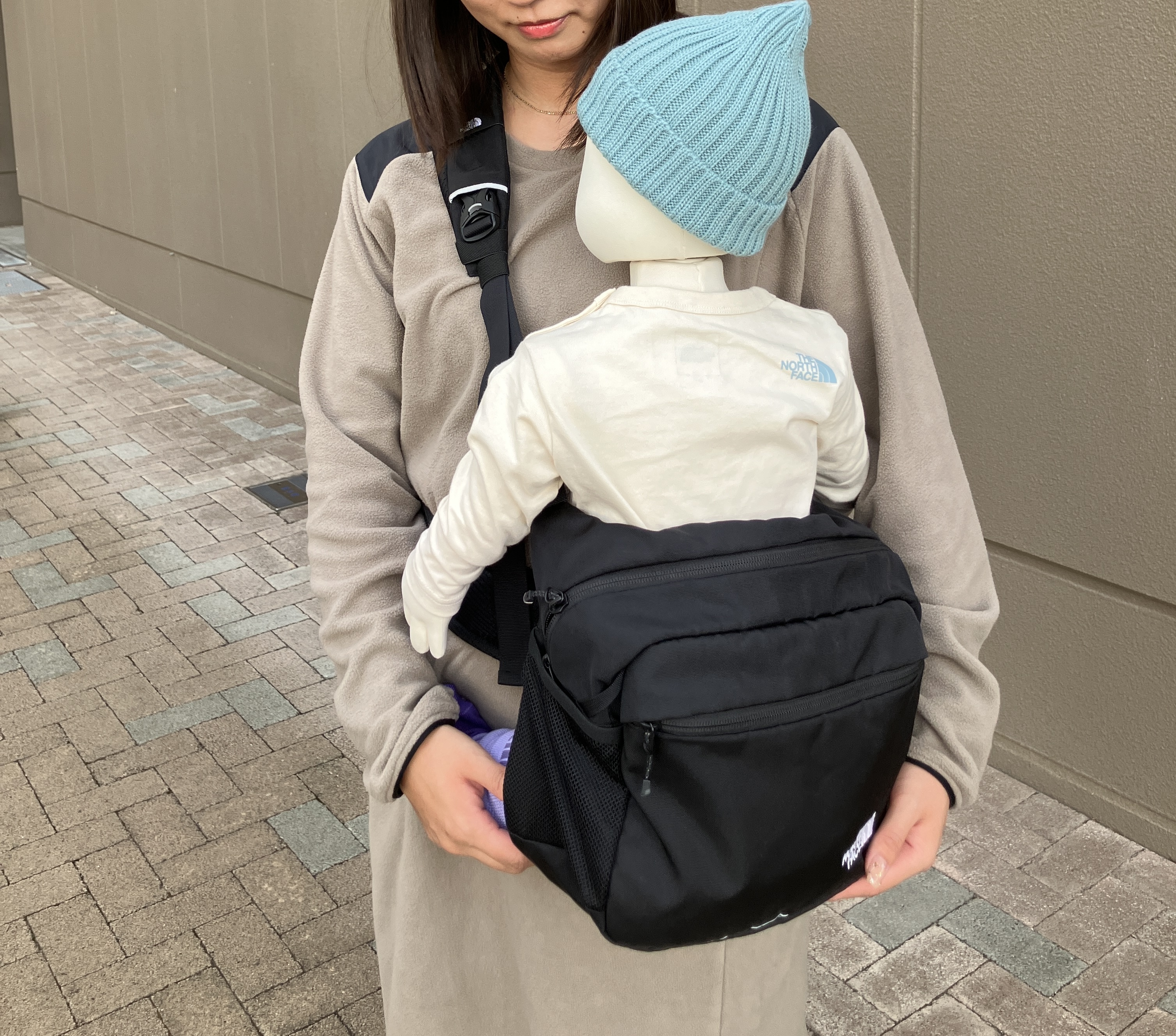 肩と腰で支えるので抱っこがとにかくラクちん、荷物もたっぷり入る便利なスリングバッグです。