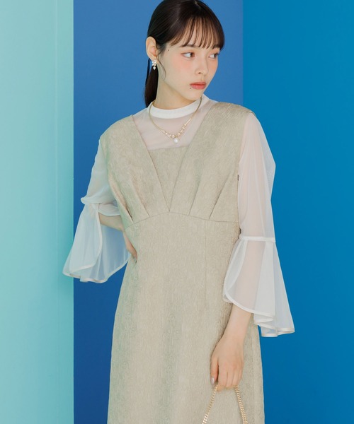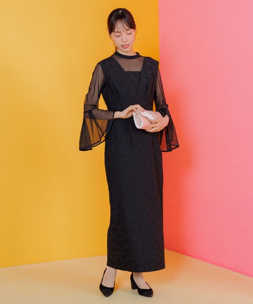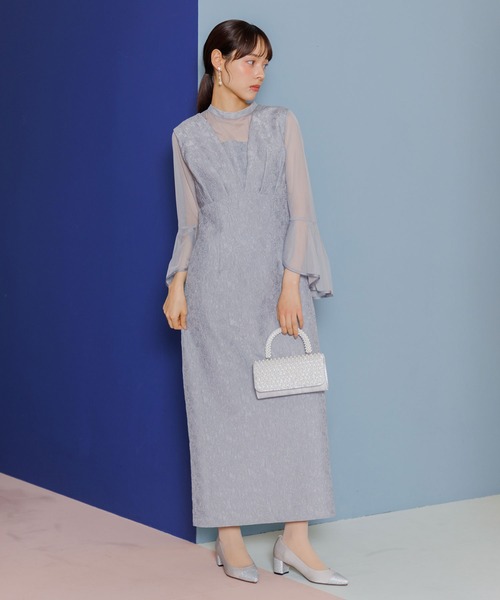 高級感のあるジャガードを使ったIラインシルエットドレスはジャンパスカートデザインのドレスと