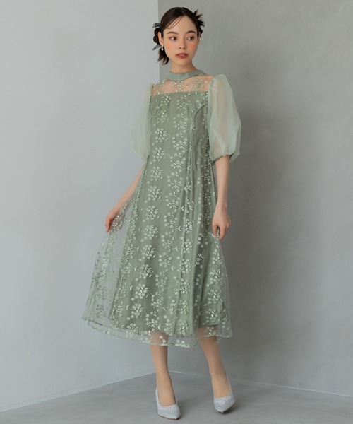 オーガンジーパフスリーブ フラワー刺繍レースドレス