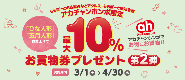 アカチャンホンポでお得にお買物!!「ひな人形」「五月人形」お買上げで最大10%のお買物券をプレゼント!