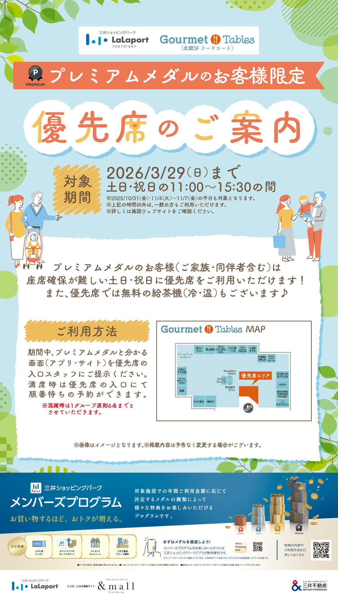- 三井ショッピングパークメンバーズプログラム プレミアムメダルのお客様限定 北館3階フードコート(グルメテーブルズ)優先席のご案内