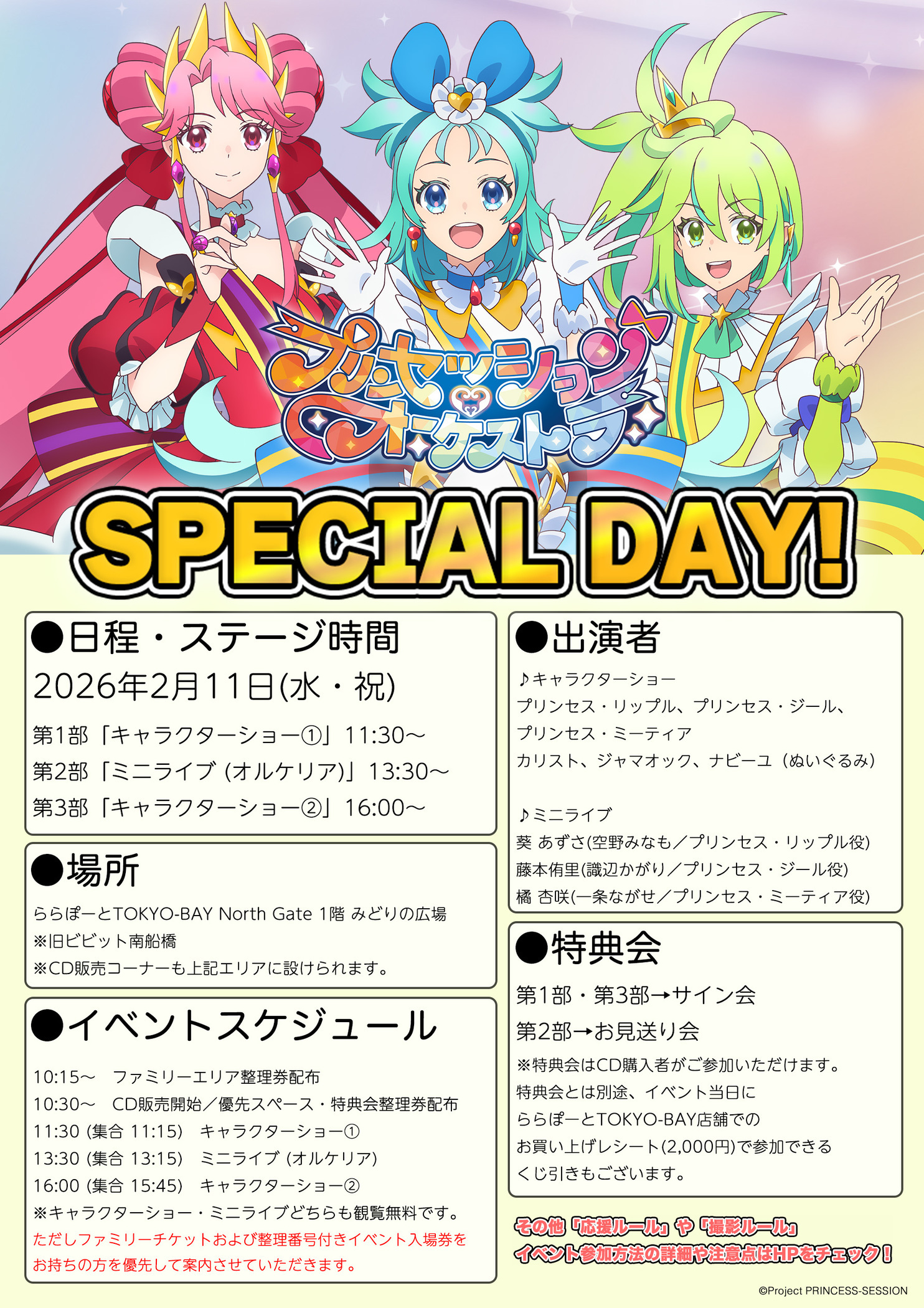 2/11(水・祝)、ららぽーとTOKYO-BAY North Gateにて、プリンセッションオーケストラ「SPECIAL DAY」を開催!!