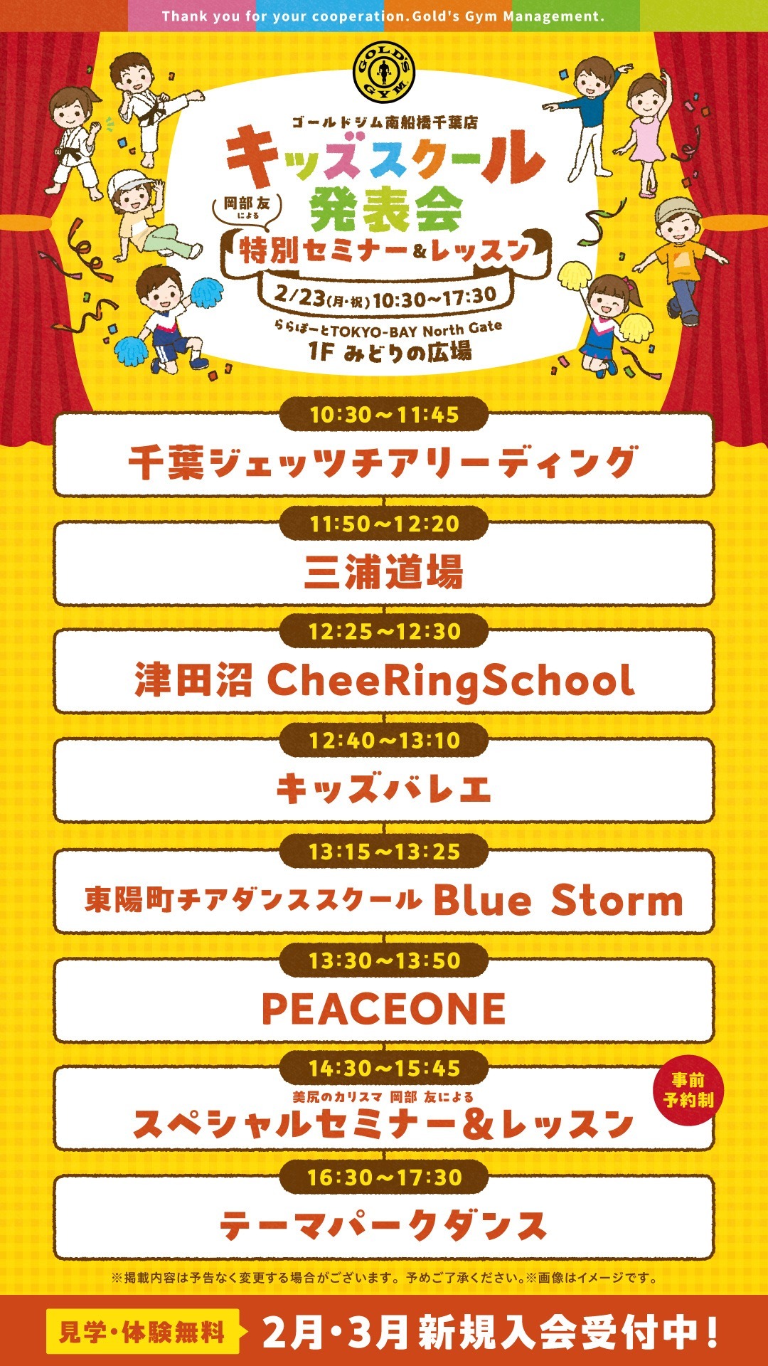 ゴールドジムキッズスクールの発表会及び、岡部友による特別セミナー&レッスンを開催いたします。