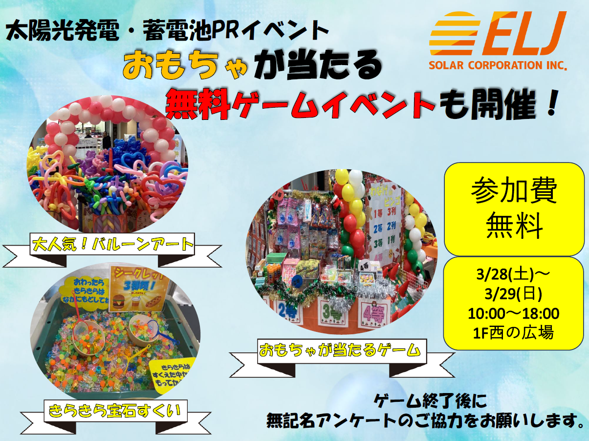 無記名アンケートでどなたでもご参加できます。風船やおもちゃが当たる無料ゲームを開催しております。ご家族皆さんでぜひご参加ください!併せて、太陽光発電や蓄電池の相談会も実施中ですので、お気軽にお問合せください!