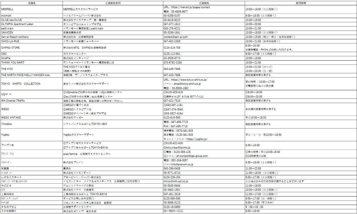 • 10/13(月・祝)北館Ⅱ期エリア営業終了店舗のお問い合わせ先③