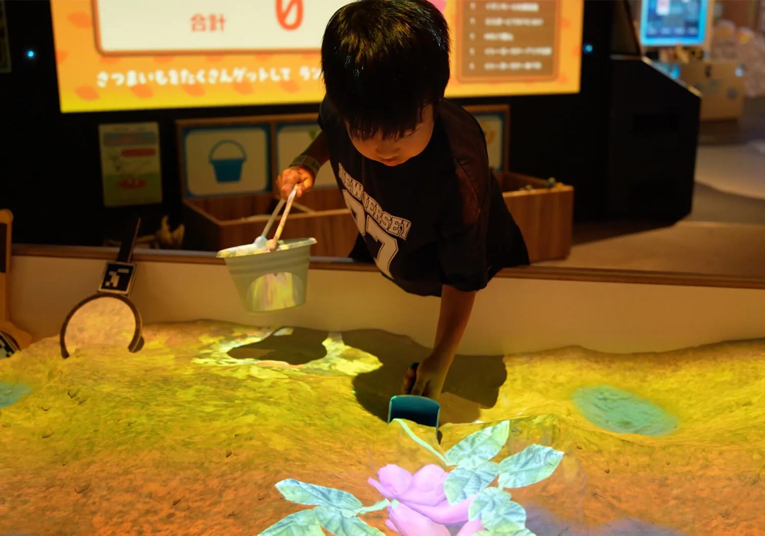 本物の砂を使ったデジタル砂場では“おいも掘り大会”が開幕!掘ったおいもの数を全国のリトルプラネットで競います。