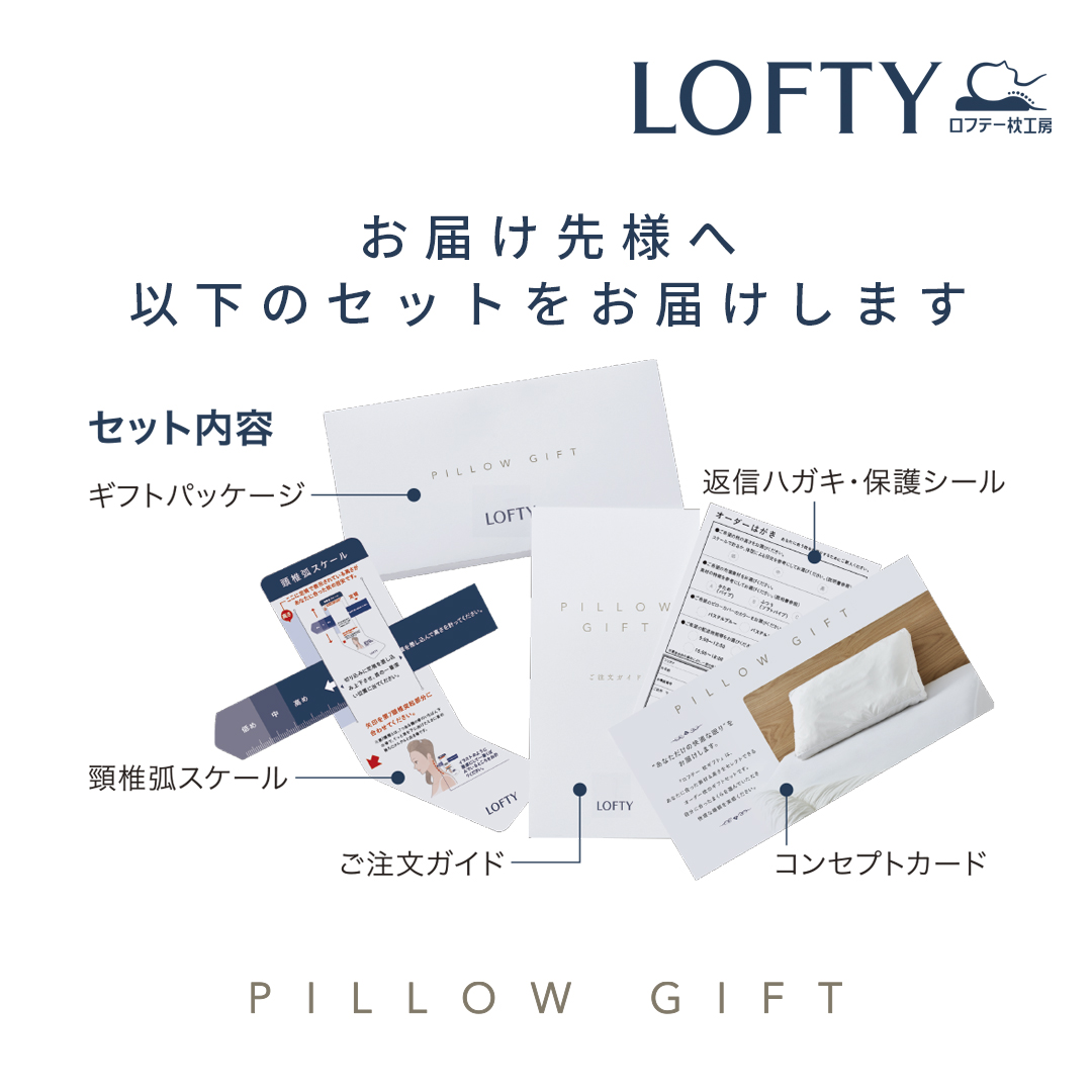 枕ギフトは、首の後ろの高さを測るスケールと注文ハガキがセットになったパッケージ商品です。スケールで計測後、同封のハガキかWEBからご注文頂き、約2週間でご注文の枕をお届けします。