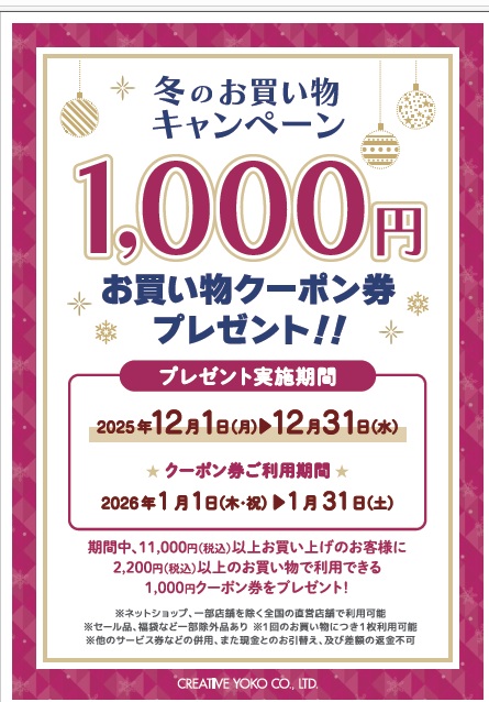 2,200円(税込)以上のお買い物で利用できる1,000円クーポン券プレゼント