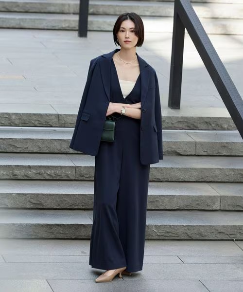 同素材のジャケット/ワイドパンツ/ベスト/オールインワンの計4型ございます!
