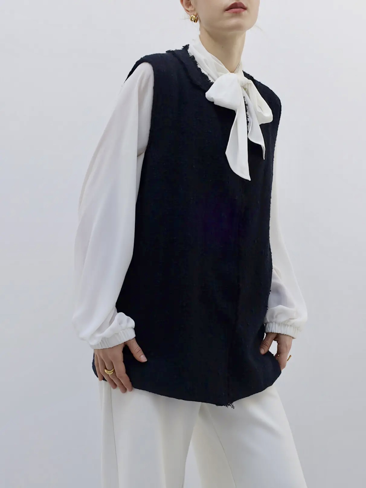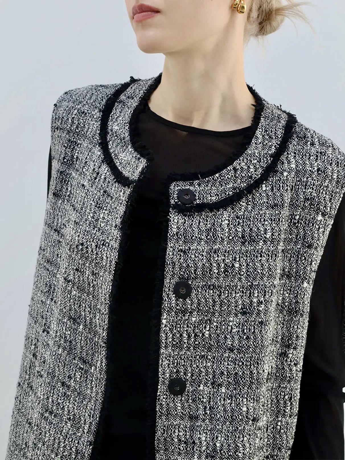 多色の糸で織り上げたツイード素材ならではの、奥行きと表情が魅力のジレ。