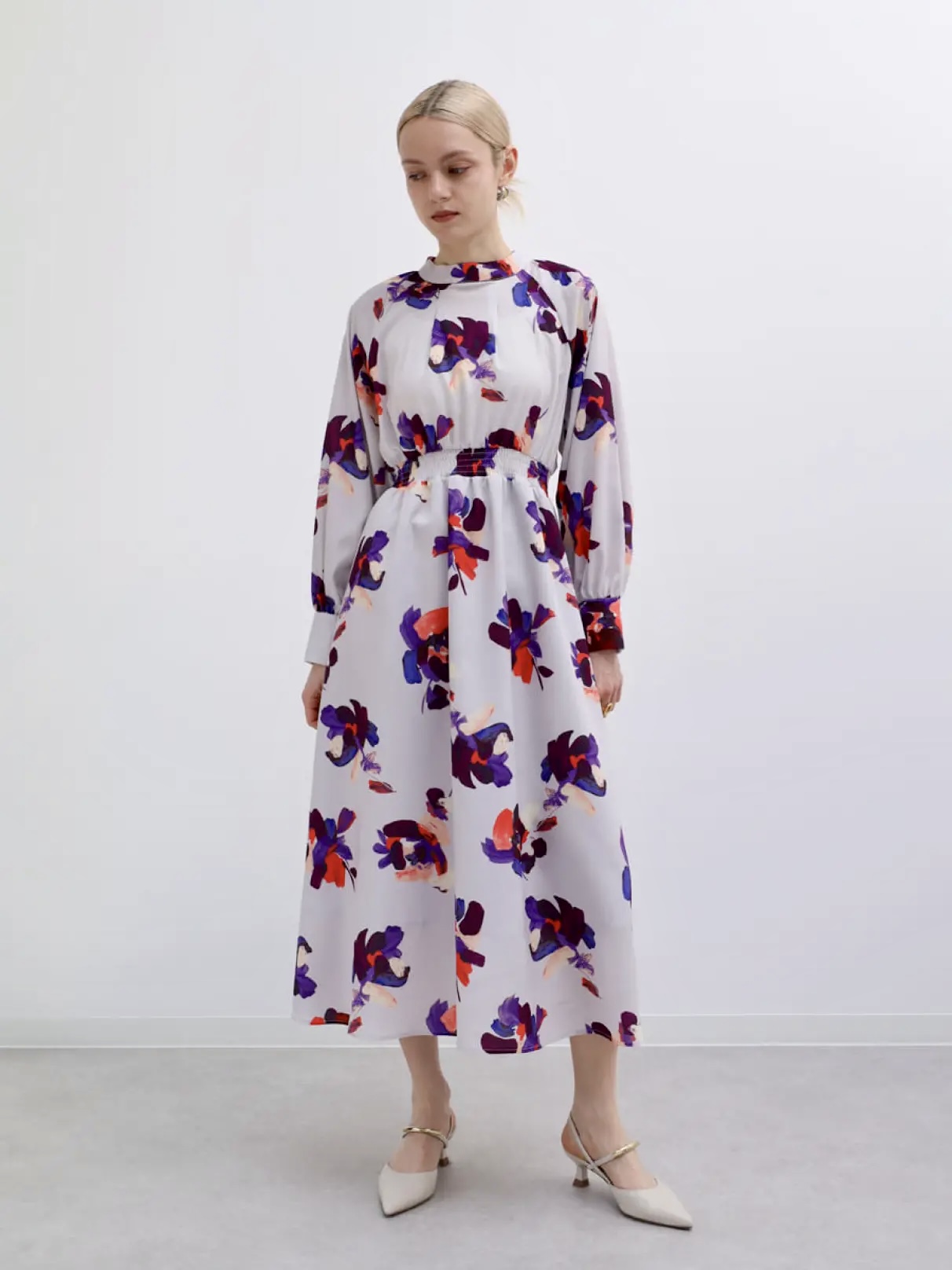 華かな配色のフラワープリントが目を惹くフレアワンピース。色合いとペイントタッチとが相まり、まるで絵画のような奥ゆかしい印象をもつ逸品。