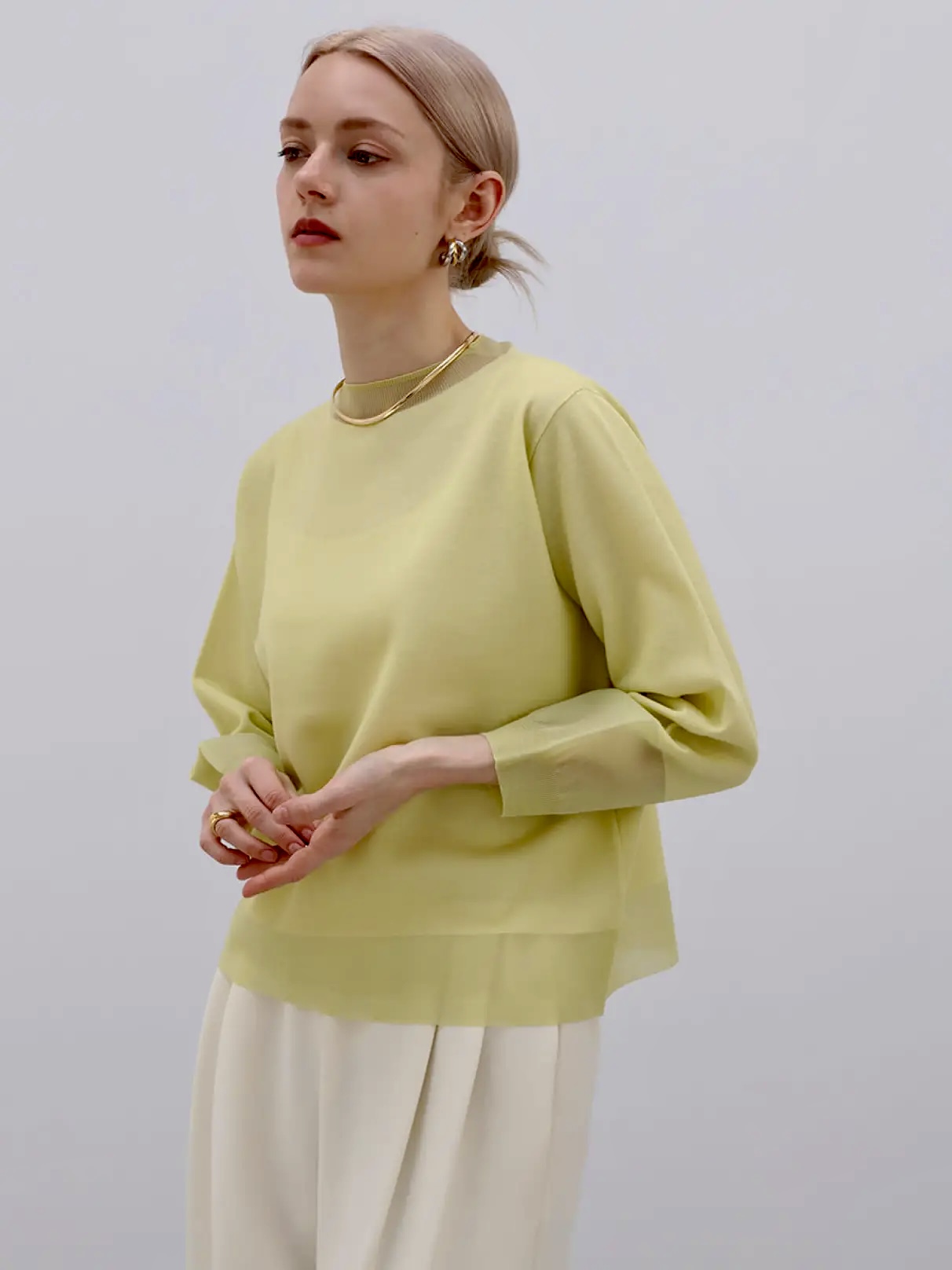 ディテールにシアー素材をドッキングさせた、大人な抜け感あるデザインが魅力のプルオーバー。首元や手首部分にシアーをドッキングさせることで、女性らしいすっきりとした印象に仕上がります。