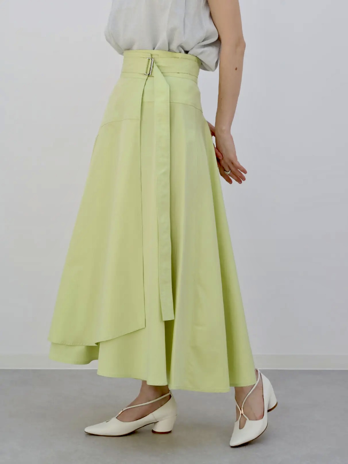 アシンメトリーに重なる裾がボリューム感を演出する、ラップデザインが魅力的なAgaロングセラーのスカート。重なり部分が少しずれるランダムな合わせがニュアンスのある表情を与え、すっきりとしたウエストから裾にかけて広がる美しいフレアラインが人気高いポイント。
