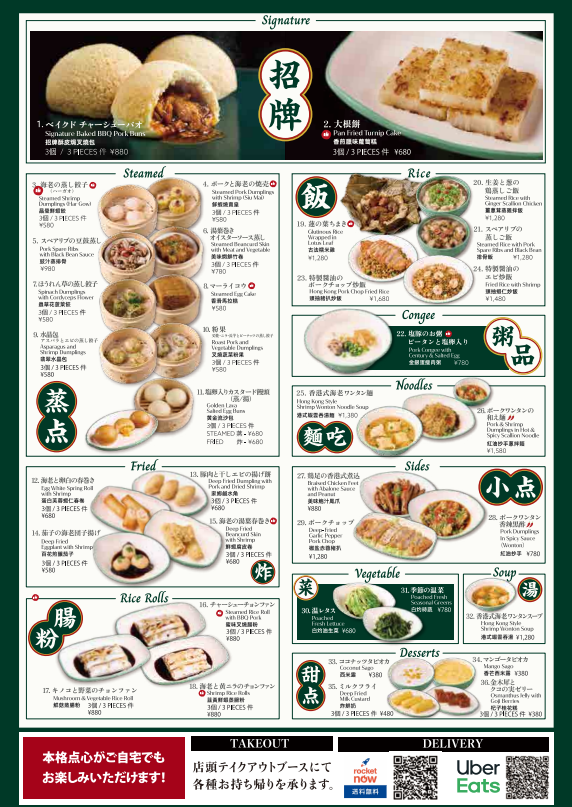提供される点心は、全てオリジナルレシピによるもので、一つ一つが各店の厨房で丁寧に手作りされます。メニューは、蒸物、揚物、米粉春巻き、粥、ちまき、野菜、デザートなどのカテゴリーで構成され、中でもチャーシューメロンパンとも呼ばれる看板メニュー「ベイクド チャーシューバオ」は、ほとんどのゲストが注文する必食メニューとなっています。
