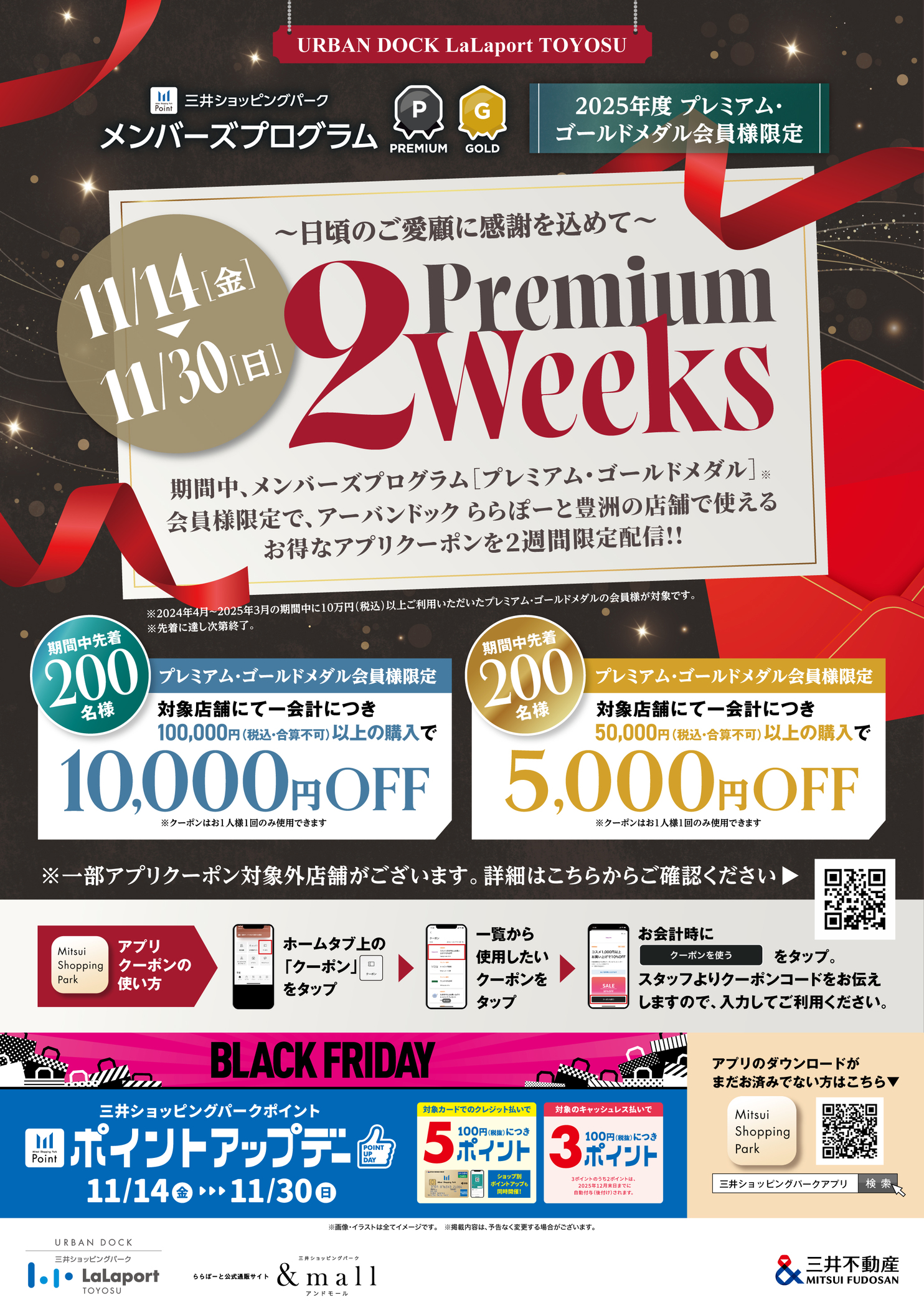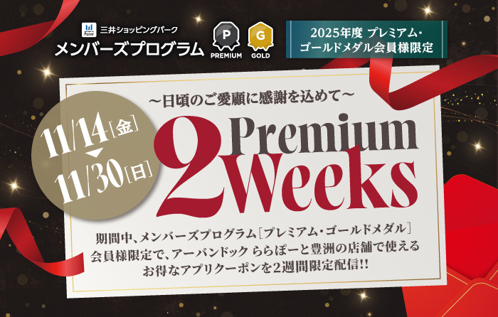 期間中、メンバーズプログラム 〔プレミアム・ゴールドメダル〕会員様限定で下記の対象店舗にて使えるお得なアプリクーポンを2週間限定配信!