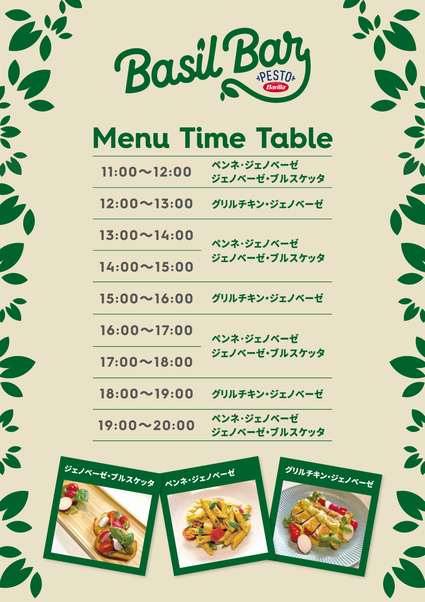 100%イタリア産バジルとパルミジャーノ・レッジャーノを使用した「ペースト ジェノベーゼ」を使った3種類の試食メニューをお楽しみいただけます。
