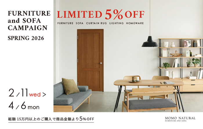 モモ ナチュラルでは2026年2月11日(水)より春のフェア”FURNITURE & SOFA CAMPAIGN – 5%OFF LIMITED DATE 2026 spring – “を開催いたします。