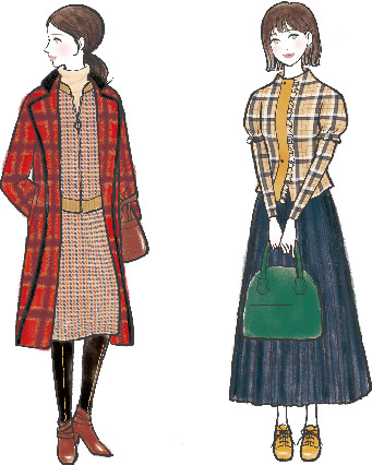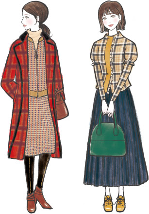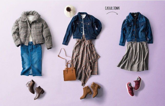 左:西川/チェック2WAYショートダウン 41,040円(税込) ボートネックリブニットプルオーバー 9,936円(税込) デニムタイトスカート 7,020円(税込) サイドゴアショートブーツ 14,040円(税込)/ナノ・ユニバース 1F 中:リブニットベレー帽 4,536円(税込) デニムジャケット 10,584円(税込) ワイドリブハイネックニット 8,100円(税込) ラップ風ミディスカート 12,960円(税込) スエードジップブーツ 17,064円(税込) スクエアレザートート 10,800円(税込)/フレディ&グロスター 1F 右:デニムBIG Gジャン 4,309円(税込) テレコハイネック 2,149円(税込) グレンチェックスカート 3,229円(税込) スニーカー 9,180円(税込)/アースミュージックアンドエコロジーナチュラルストア 2F
