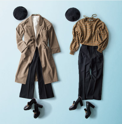 左:ベレー帽 4,298円(税込) ロングコート 11,664円(税込) エンブロイダリーブラウス 8,629円(税込) クロップドフレアパンツ 8,629円(税込) ヒールローファーパンプス 11,664円(税込) 右:ベレー帽 4,298円(税込) バックリボントップス 6,458円(税込) クロップドフレアパンツ 8,629円 ヒールローファーパンプス 11,664円(税込)/マウジー 2F