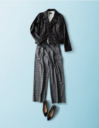 ダブルライダースジャケット 48,600円(税込) ハイネックブラウス 12,960円(税込) チェックワイドパンツ 15,984円(税込) スタッズフラットポインテッド 24,840円(税込) ANOTHER ITEM:ストール 11,880円(税込)/シップス 1F