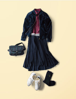 ベルベットボンバージャケット 27,000円(税込) ギンガムチェックブラウス 15,120円(税込) プリーツスカート 17,280円(税込) ブラックウォッチソックス 1,728円(税込) スニーカー 12,420円(税込) ブラックウォッチショルダーバッグ 10,800円(税込) ANOTHER ITEM:スニーカー 22,680円(税込) ブラックウォッチリュック 15,120円(税込)/フレッドペリー 2F