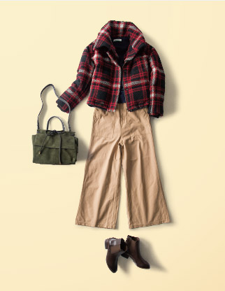 西川/チェック2WAYショートダウン 41,040円(税込) Vネックニットプルオーバー 8,424円(税込) バックサテンベイカーワイドパンツ 8,100円(税込) サイドゴアショートブーツ 14,040円(税込) リボンフラップトート 15,984円(税込)/ナノ・ユニバース 1F