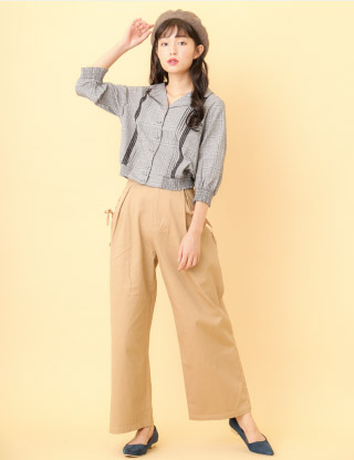 バスクベレー帽 ブラウン 2,700円(税込) 開襟シャツブラウス 4,212円(税込) レースアップワイドパンツ 5,292円(税込) ふわっとカラーパンプス グリーン 4,212円(税込)/アナザーブランチ バイオリーブデオリーブ 2F