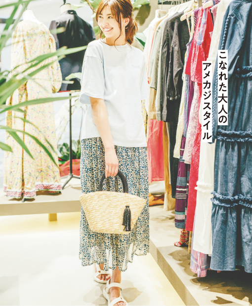 別注丸胴ラフィー天竺Tシャツ 8,640円(税込) ジョーゼット花柄スカート 10,584円(税込) TEVAハリケーン 8,424円(税込) ビーズハンドルカゴバッグ 4,860円(税込) フリークス ストア 1F