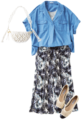 ざっくりしたシルエットのスキッパーシャツで大人のこなれ感を演出。柔らかな肌触りのワイドパンツを合わせた、リゾートカジュアルスタイル。